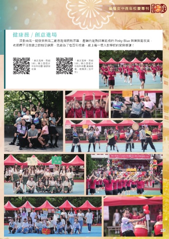 基隆女中百年校慶專刊 健康操 / 創意進場 活動由高一健康操與高二創意進場開啟序幕,壓軸的是教師團組成的 Pinky Blue 舞團舞蹈表演, 老師們平日教書之餘抽空練舞,就是為了在百年校慶,獻上每一個人對學校的愛與感謝! 「基女風華、飛越 「基女風華、飛越 100」國立基隆女 100」國立基隆女 中百年校慶 健康操 中百年校慶 創意進 表演 場 - 教職員 ( 含空 拍) 167 167