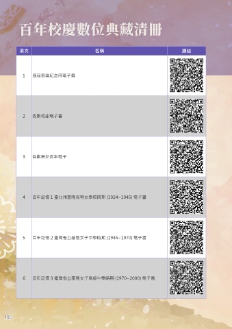 項次 名稱 連結 1 歷屆畢業紀念冊電子書 2 各期校訊電子書 3 各期基女青年電子 4 百年記憶 1 臺北州基隆高等女學校時期 (1924~1945) 電子書 5 百年記憶 2 臺灣省立基隆女子中學時期 (1946~1970) 電子書 6 百年記憶 3 臺灣省立基隆女子高級中學時期 (1970~2000) 電子書 192 192