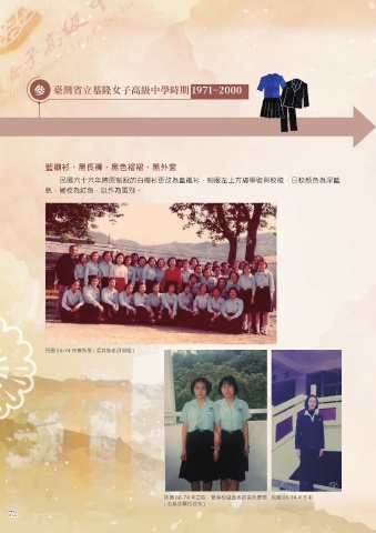 參 臺灣省立基隆女子高級中學時期 1971~2000 藍襯衫、黑長褲、黑色褶裙、黑外套 民國六十六年將原制服的白襯衫更改為藍襯衫,制服左上方繡學號與校徽,日校顏色為深藍 色,補校為紅色,以作為區別。 民國 66-74 年春秋服 ( 湯其傑老師捐贈 ) 民國 66-74 年夏服,繫有校徽圖案的黑色腰帶 民國 66-74 年冬服 ( 右為沈麗枝校友 ) 72 72