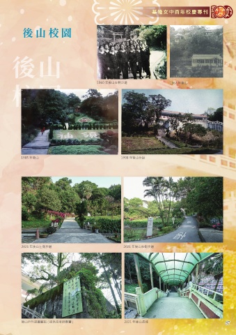 基隆女中百年校慶專刊 後山 1960 年後山左側步道 1967 年後山 校園 1985 年後山 1998 年後山步道 2021 年後山左側步道 2021 年後山右側步道 後山戶外裝置藝術 ( 徐洪宗老師墨寶 ) 2021 年後山長城 97 97